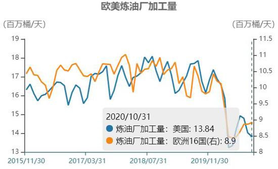 欧美炼厂开工率反弹后仍处于相对低位,回升幅度放缓,短期需求不强。