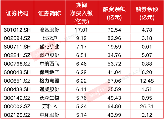 按行业分布来看,这些增量资金主要流向了电气设备、有色金属、医药生物、汽车、电子和房地产行业,流入规模均在10亿元以上,其中电气设备行业获得的资金最多为64.30亿元。具体到公司层面也是如此,据记者统计,“融资客”增持在5亿元以上的个股共有11只(见表2),其中电气设备行业的隆基股份获得了“融资客”最大手笔的加码,在此期间被净买入17.01亿元。其次分别是汽车行业的比亚迪和有色金属行业的盛屯矿业,它们被净买入的规模分别为9.19亿元和7.17亿元。