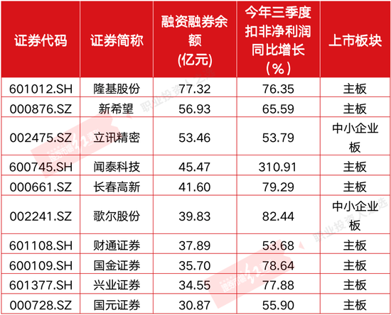 据此,《红周刊》记者筛选出今年三季度扣非净利润增速在50%以上、主板或中小企业板上市的129家公司(见表4)。其中,隆基股份、新希望和立讯精密等个股目前两融余额较高。这就是说,在两融余额持续上涨的情况下,这些个股或将率先突破百亿大关。