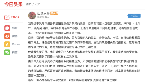 12月24日午时,沈阳新冠确诊者尹某某的另一名密接者在网络上发声。他撰文写道,从23日起不断接到陌生电话和恶语攻击的短信。由于他和家长的个人信息都被暴露在网上,“目前,我的精神处于完全崩溃状态。”