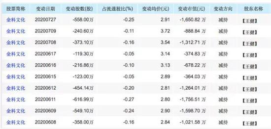 然而从2019年6月任金科文化董事长开始,王健便开启“减持模式”。第一次减持的时候,王健的减持理由为用于偿还股票质押融资款项,以降低股票质押比例。到2019年12月18日,王健共减持公司股份6927.77万股,占公司总股本1.98%。2020年1月13日王健再次以同样的理由称将拟减持不超2%股份。