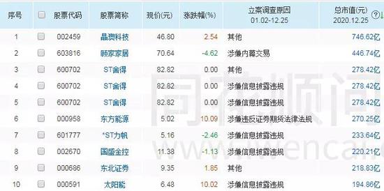股价方面来看,受到立案调查等方面的影响,截至12月25日收盘,有22家企业出现股价下跌,跌幅最大的为嘉澳环保(维权),跌幅为9.98%。