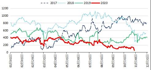 进口蒙煤方面,23日开始甘其毛都口岸入境时间从17点闭关再次缩短为仅上午可以通关,司机不允许留宿,且必须带7天内核酸检测报告。据中国煤炭资源网11月26日了解,口岸防疫措施再度加严,甘其毛都口岸25日开始入境车辆必须接受中国方核酸检测才可入境,截止25日本周日均通关仅为163车,较上周平均降423车,虽然蒙古方目前仍在积极推进增加出口,但是在现有条件下,预计短期内通关难有明显增量。
