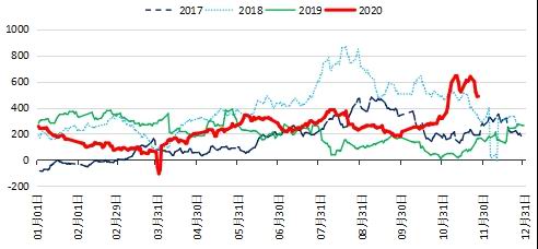 截至11月29日,焦煤JM2101合约涨幅5.38%,最低价1293.5,最高价1439.5;焦炭J2101合约涨幅12.37%,最低价2190,最高价2512。11月月报中,我们建议“焦煤JM2101合约运行区间参考1325-1400;焦炭J2101合约参考2100-2300,逢低偏多参与”,焦煤的走势基本符合我们的判断,也把握了焦炭的方向,但焦炭的涨幅有点出乎意料。