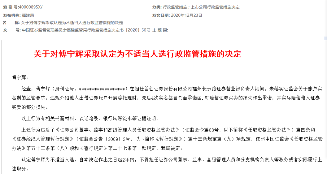 12月25日,福建证监局发布的行政监管信息显示,首创证券福州长乐路证券营业部负责人傅宁辉,未落实证监会关于账户实名制的监管要求,违规介绍他人出借证券账户开展委托理财,先后4次实名签署书面承诺函,对赔偿证券买卖的损失作出承诺,并实际赔偿他人证券买卖的部分损失,被认定为不适当人选,自处罚决定起2年内不得担任券商董监高及分支机构负责人等职务或实际履行上述职务。