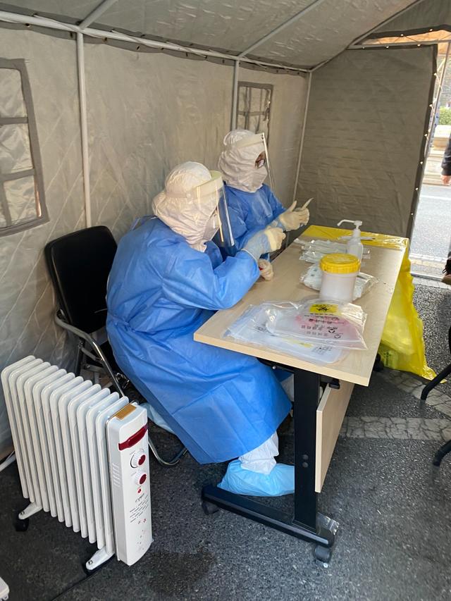 几乎没有等候,居民们每两人为一组,被“分流”至核酸检测采样点的帐篷,接受检测。每桌两位“全副武装”的医务人员为居民进行咽拭子采集。