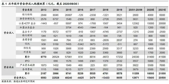 当前A股也处在牛市第三阶段,目前市场赚钱效应较好,吸引增量资金入市,典型代表就是公募基金大发行,从而我们认为2021年更类似迷你版的2007年。《增量资金望超两万亿——2021资金入市测算-20201204》中,我们测算到参考05-07年牛市经验,宏观流动性收紧后微观股市资金仍在加速入场。目前wind统计下已经通过审核但是尚未发行的股票型和混合型基金有350只,考虑到wind口径有疏漏(今年一共发了800多只基金,但是wind只有400只基金的数据,占比大概50%),箭在弦上的基金可能已经超过700只。假设每只基金平均发行份额为25亿份(今年800只新发基金对应2万亿新发份额),再假设每只基金的股票仓位为80%,则光明年一季度乃至二季度前半段入市的基金就有望超过1.4万亿。我们预计2020年全年资金净流入1.5万亿,2021年超2万亿元,具体测算数据如下表1。