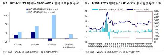 市场背景不像:16-17年是结构市,19-20年是牛市。之前我们写过专题报告分析过,股市状态分为牛市、熊市、震荡市(结构市),分别类似夏天、冬天、春秋天。16-17年是类似春秋天的结构市,但19年以来是类似夏天的牛市,牛市三个特征全出现:指数普遍上涨、大多数个股涨、场外资金入市,而16-17年期间一个都没有。从主要指数涨幅看,16/01/27-17/12期间上证指数区间涨跌幅为20%,沪深300为37%,创业板指为-12%,而19/01-20/12期间上证指数区间涨幅为36 %,沪深300为69%,创业板指为132%。从个股涨幅看,16/01/27-17/12期间A股(不考虑新股)共计2772只,其中1443只上涨,占比为52%,期间全部A股涨跌幅中位数为-3.9%。19/01-20/12期间A股(不考虑新股)共计3542只,其中2474只上涨,占比为70%,期间全部A股涨幅中位数为23%。从场外资金看,A股资金流入项包括银行转账、融资余额增加、公募+ETF基金发行、私募证券基金、基金专户、银行理财、券商资管、信托、保险类和外资,资金流出项目包括IPO、产业资本减持、各项税费等,按照以上明细项目统计,16/01-17/12期间A股市场累计增量资金为-1946亿元,而19/01-20/12期间为2.4万亿元。