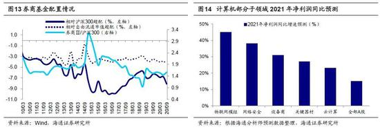 中长期科技+消费。当前正处政策红利和技术红利叠加期,中长期视角看,本轮牛市是转型升级牛,主线是科技+消费。我们认为21年行业配置的第一梯队是科技:一是政策推动,中央经济工作会议将“强化国家战略科技力量”列为排名第一的重点任务,继续强调依托新型举国体制突破核心技术、解决一系列“卡脖子”问题,同时强调了清洁能源、绿色发展,“十四五”规划建议稿也强调坚持创新驱动发展,科技自立自强,加快在关键核心技术领域实现突破;二是产业链扩散,2010-2015年前后科技股行情上下游行业间传导过程是从电子设备开始、逐渐向软件内容传导并扩散至场景应用,当前正处5G引领的新一轮科技周期中,前期以硬件为主,中后期带动软件革新需求,最终万物互联、人工智能,依照硬件-软件-内容-应用场景规律,往后看计算机(云计算、人工智能)、传媒(游戏等)、新能源产业链等产业发展空间更大。科技的背面是券商。短期看,牛市成交量放大将推高券商业绩,20Q3券商归母净利润单季度同比高达73%,但今年以来申万券商行业涨幅只有8%;中期看,金改将改变券商业态,当前中国产业结构升级目标类似美国,即大力发展科技产业,融资结构也将对标,然而美国券商ROE13%、中国仅6%,我们认为金改最终将提高券商ROE。20Q3基金重仓股中券商股持有市值占比为1%,相比沪深300(自由流通市值)低配8.1(4.3)个百分点。