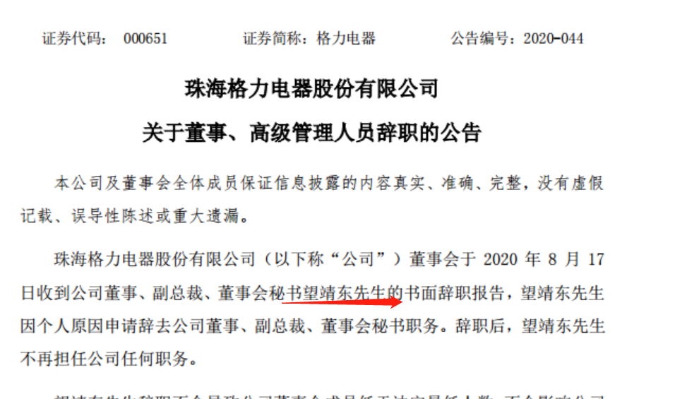 此前,市场预期格力电器下一任掌门人“可能人选”为前董事、副总裁、董秘望靖东。望靖东于2002年入职格力,在格力电器“服役”达到18个年头,一路走来,曾任格力电器财务部部长、采购部部长、审计部部长、总裁助理、财务负责人及副总裁和董秘等职。望靖东深受董明珠信赖,其出镜频率也非常之高,一度被传为董明珠指定的接班人之一。不过,在格力电器举牌海立股份时,望靖东卷入内幕交易案,于今年8月份从格力电器离职,辞职后,望靖东不再担任公司任何职务。