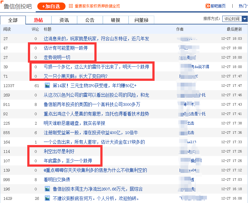 针对上述公告,股吧网友纷纷留言。有网友表示,“估计有可能星期一跌停”,“亏损一个多亿,这么大的雷终于出来了,明天一个跌停跑不了了,”,有投资者称,“年底雷多,至少一个跌停”。
