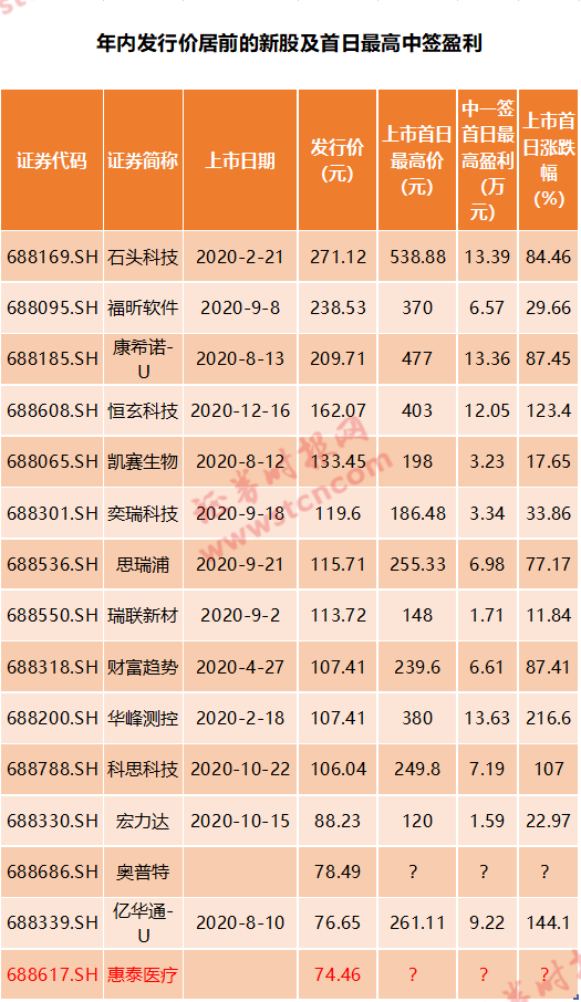 除了石头科技外,还有康希诺-U、恒玄科技、华峰测控中一签首日最高盈利超过10万元,这些新股发行价均较高。