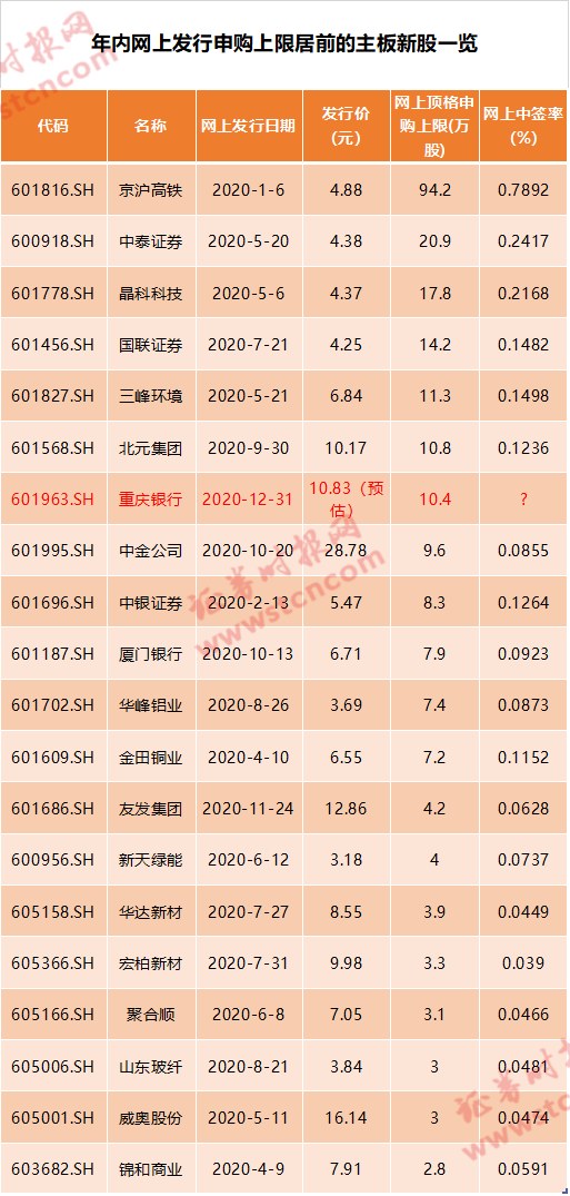 资料显示,重庆银行此番计划发行约3.47亿股,网上顶格申购上限10.4万股,这一数据在年内主板新股中居于前列。