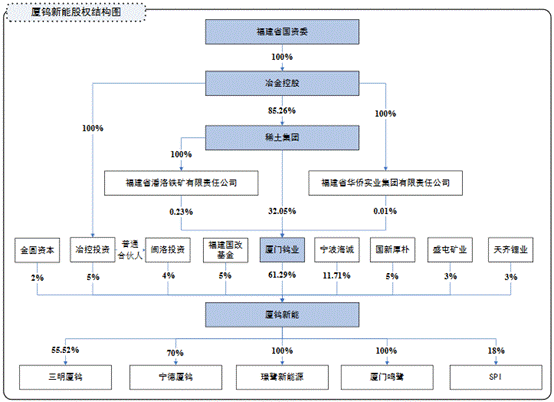 厦钨新能实际控制人是福建省人民政府国有资产监督管理委员会(福建省国资委),控股股东是厦门钨业股份有限公司(以下简称“厦门钨业”),福建省稀有稀土(集团)有限公司(以下简称“稀土集团”)和福建省冶金(控股)有限责任公司(以下简称“冶金控股”)是厦钨新能的间接控股股东。其中,稀土集团是厦门钨业控股股东,冶金控股是稀土集团控股股东。