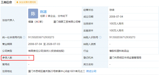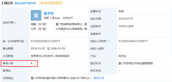 公开信息显示,包头市杰朗镍盐有限公司成立于2015年5月12日,注册资本100万元,无实缴资本数据,参保人数为0人。厦门榕祺新能源有限公司成立于2018年3月7日,注册资本为500万元,无实缴资本数据,参保人数8人。厦门信晖工贸有限公司成立于2018年3月7日,注册资本为100万元,实缴资本100万元,参保人数1人。