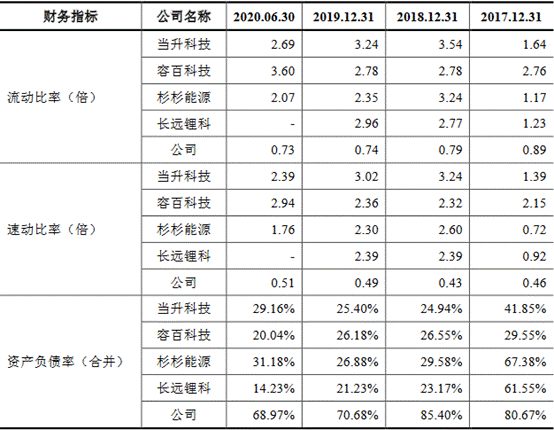 过去三年及一期,同行业可比公司当升科技流动比率分别为1.64、3.54、3.24和2.69,速动比率分别为1.39、3.24、3.02和2.39,资产负债率(合并)分别为41.85%、24.94%、25.40%和29.16%;容百科技流动比率分别为2.76、2.78、2.78和3.60,速动比率分别为2.15、2.32、2.36和2.94,资产负债率(合并)分别为29.55%、26.55%、26.18%和20.04%;杉杉能源流动比率分别为1.17、3.24、2.35和2.07,速动比率分别为0.72、2.60、2.30和1.76,资产负债率(合并)分别为67.38%、29.58%、26.88%和31.18%;长远锂科流动比率分别为1.23、2.77、2.96、未披露,速动比率分别为0.92、2.39、2.39、未披露,资产负债率(合并)分别为61.55%、23.17%、21.23%、14.23%。