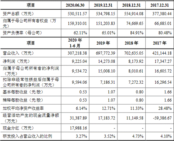 2017年、2018年、2019年和2020年上半年,厦钨新能实现营业收入分别为42.11亿元、70.26亿元、69.78亿元和30.72亿元,实现净利润分别为1.73亿元、8173.92万元、1.43亿元和9225.04万元,实现扣除非经常性损益后归属于母公司所有者的净利润分别为1.63亿元、7272.32万元、7186.31万元和9594.06万元。