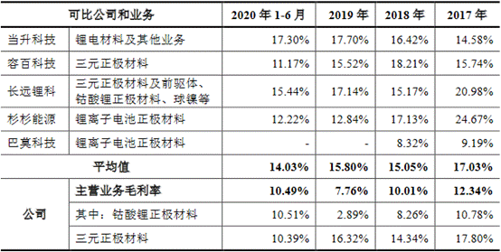 过去三年及一期,同行业可比公司中,当升科技业务为锂电材料及其他业务,毛利率分别为14.58%、16.42%、17.70%和17.30%;容百科技业务三元正极材料,毛利率分别为15.74%、18.21%、15.52%和11.17%;长远锂科业务为三元正极材料及前驱体、钴酸锂正极材料、球镍等,毛利率分别为20.98%、15.17%、17.14%和15.44%;杉杉能源业务为锂离子电池正极材料,毛利率分别为24.67%、17.13%、12.84%和12.22%。同行业可比公司报告期内毛利率平均值分别为17.03%、15.05%、15.80%和14.03%。