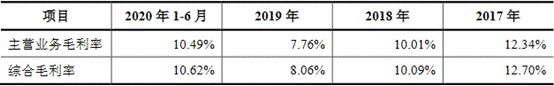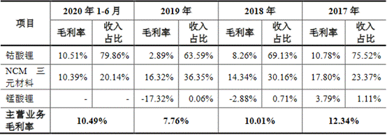 2017年、2018年、2019年和2020年1-6月,厦钨新能主营业务毛利率分别为12.34%、10.01%、7.76%和10.49%,综合毛利率分别为12.70%、10.09%、8.06%和10.62%。