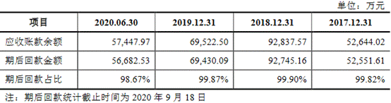 截至2020年9月18日,厦钨新能报告期各期末应收账款期后回款金额分别为5.26亿元、9.28亿元、6.94亿元和5.67亿元,回款比例分别为99.82%、99.90%、99.87%、98.67%。