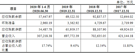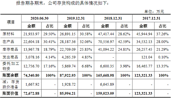 报告期内,该公司存货中,原材料金额分别为4.59亿元、4.74亿元、2.69亿元和2.19亿元,占比分别为37.26%、28.62%、30.58%、29.50%;在产品金额分别为3.45亿元、7.06亿元、2.82亿元和2.26亿元,占比分别为28.00%、42.59%、32.06%和30.41%;库存商品分别为2.63亿元、4.11亿元、2.27亿元和1.40亿元,占比分别为21.29%、24.81%、25.83%和18.79%;发出商品金额分别为121.04万元、0元、4265.59万元、3078.16万元,占比分别为0.10%、0%、4.85%和4.14%;委托加工物资分别为1.65亿元、6600.35万元、5869.74万元和1.28亿元,占比分别为13.35%、3.98%、6.68%和17.16%。