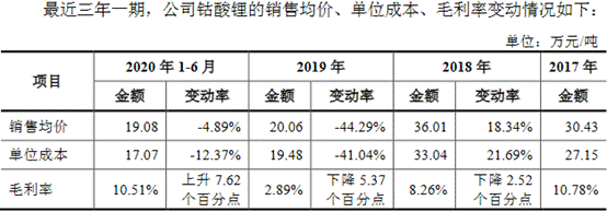 2018年、2019年、2020年上半年,该公司钴酸锂销售均价同比变动率分别为18.34%、-44.29%、-4.89%,单位成本同比变动率分别为21.69%、-41.04%、-12.37%。