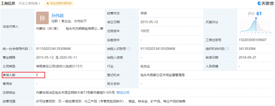 相关公开信息显示,包头市杰朗镍盐有限公司成立于2015年5月12日,注册资本100万元,无实缴资本数据,参保人数为0人。
