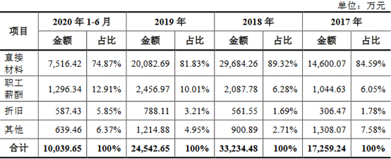 从研发费用明细来看,报告期内,该公司直接材料金额分别为1.46亿元、2.97亿元、2.01亿元和7516.42万元,占比分别为84.59%、89.32%、81.83%和74.87%;职工薪酬分别为1044.63万元、2087.78万元、2456.97万元和1296.34万元,占比分别为6.05%、6.28%、10.01%和12.91%;折旧费用分别为306.47万元、561.55万元、788.11万元和587.43万元,占比分别为1.78%、1.69%、3.21%和5.85%;其他费用分别为1308.07万元、900.89万元、1214.88万元和639.46万元,占比分别为7.58%、2.71%、4.95%和6.37%。