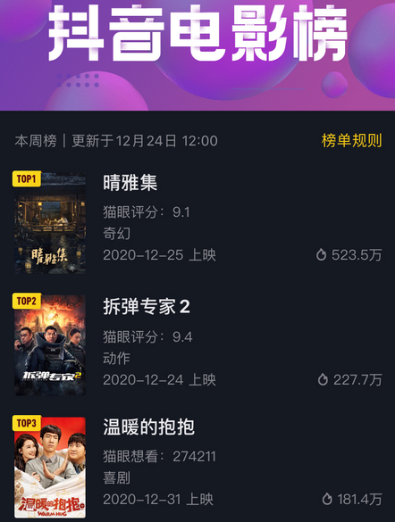 不可否认的是,深陷“郭敬明原罪论”泥潭的《晴雅集》进入本周之后屡登微博热搜,仅12月24日就有7条热搜上榜、大量路演特辑也让《晴雅集》在抖音电影榜位居第一,热度是第二名《拆弹专家2》的两倍,《晴雅集》形成强有力的下沉基础。