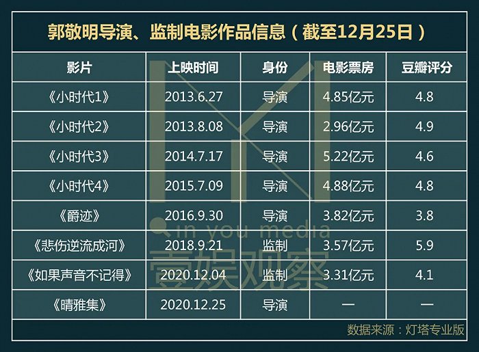 自2013年郭敬明处女作《小时代》热卖4.85亿,系列四部作品狂揽18亿元起,郭敬明作品一直与年轻观众紧密结合。