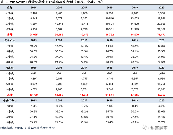 国债净发行以及发行节奏的历史规律:前低后高。从2015-2020年国债每个季度的净发行或者发行来看,均呈现出一季度较低,二至四季度较高的情况。