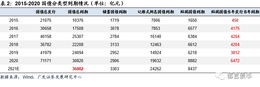 2021国债发行量估算:存在达到7万亿元的可能。由于贴现国债的期限主要是一个季度或者半年,2020年发行的15709亿元贴现国债,其中6472亿元于年内到期。2021年这种情况可能会延续,贴现式国债当年发行、当年到期的金额可能也会达到6000亿元左右,加上国债净发行、不含当年发行当年到期贴现国债的到期额,则2021年国债总发行额将达到6.9万亿元以上。