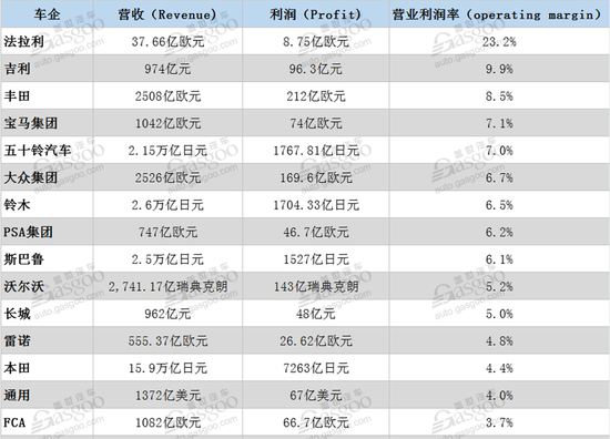图2:全球15家主流汽车制造商2019财报数据。来源:盖世汽车