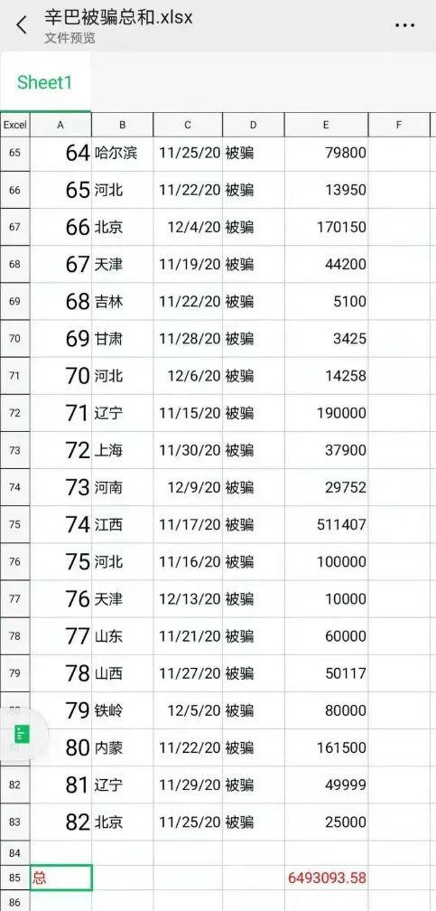 《财经》新媒体了解到,像王可一样的受害者在网络平台交流后,专门建立了微信群进行信息统计。截至12月25日,仅群里被骗人数就已经达82人,被骗金额合计高达649.31万元。