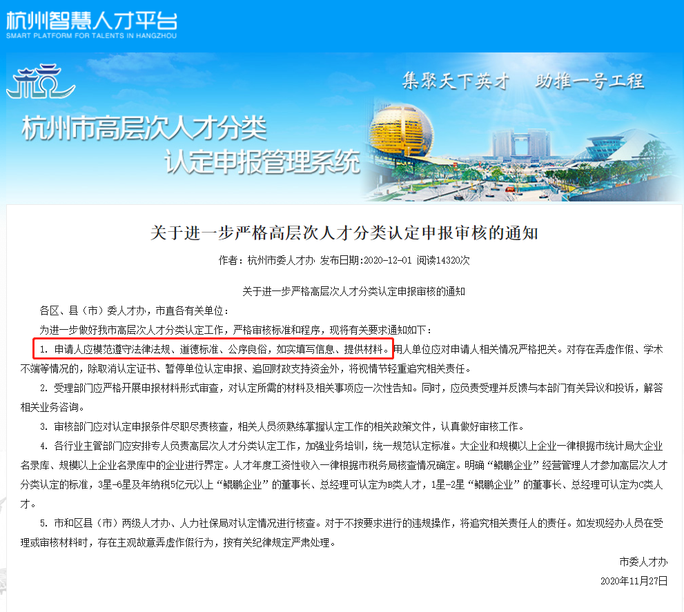 杭州市委人才办11月27日发布了《关于进一步严格高层次人才分类认定申报审核的通知》,进一步严格审核标准和程序。其中,第一条就提及,申请人应遵守模范遵守法律法规、道德标准、公序良俗,且要求用人单位对相关情况严格把关,对存在弄虚作假、学术不端等情况,将取消仍定证书和暂停单位认定申报等。
