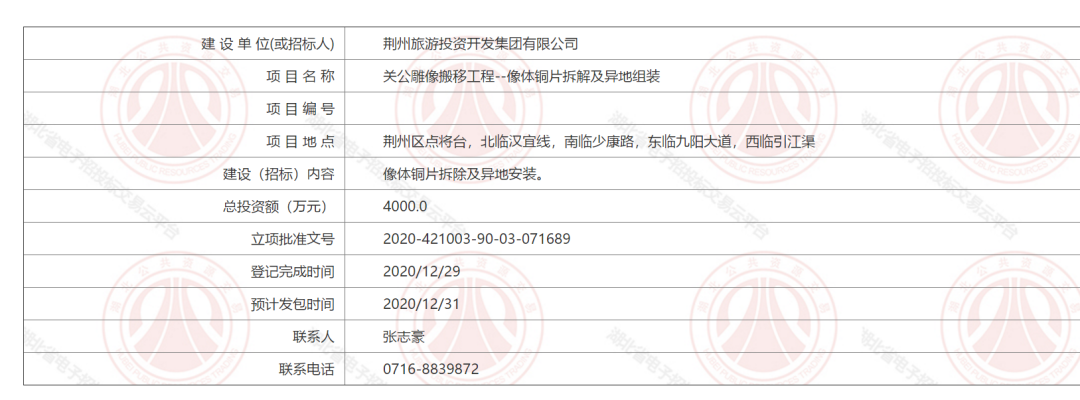 关公雕像搬移工程——像体铜片拆解及异地组装项目报建公告。湖北省电子招投标交易平台 截图