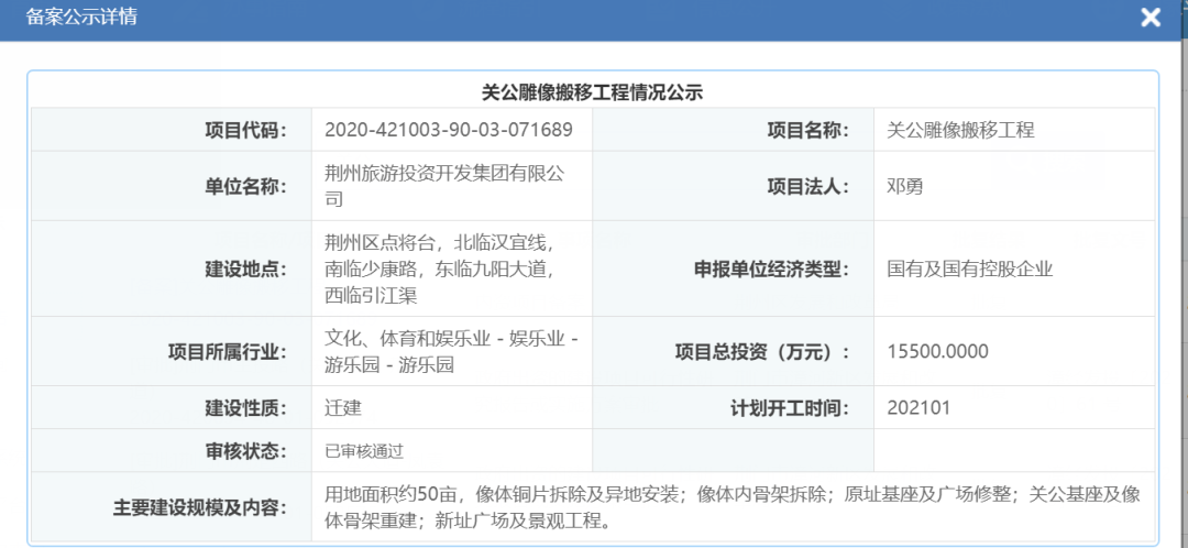 据湖北省投资项目在线审批监管平台显示,荆州区发展和改革局2020年12月17日批复的“关公雕像搬移工程”已审核通过,项目总投资为15500万元,计划开工时间为2021年1月。该工程主要建设规模及内容包括:雕像用地面积约50亩,像体铜片拆除及异地安装;像体内骨架拆除;原址基座及广场修整;关公基座及像体骨架重建;新址广场及景观工程。