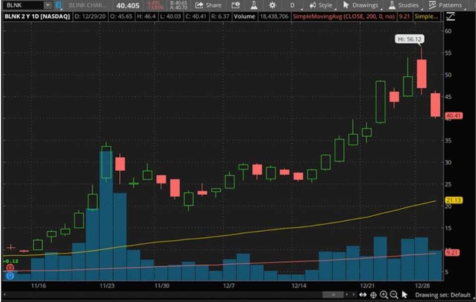Blink是一家提供电动汽车充电设备和充电服务的公司。今年,很少有股票的涨幅能与Blink相提并论。年初至今,Blink的股价累计涨超2000%,月初至今涨近60%。Blink目前的股价表现非常亮眼,该股似乎仍保持着强劲的增长势头。