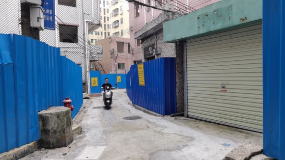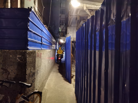 蓝色围挡一直延伸到小巷尽头。摄影:梁宙