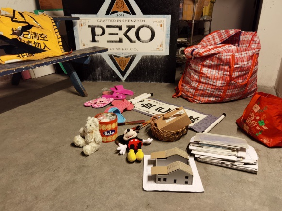 段鹏收集的旧物中,有“楼已清空 非请勿入”的告示、白石洲的三家精酿啤酒店其中两家的招牌、东北菜馆张姐的灯箱,雒大姐的杂货,做装修工作的老田的工具箱,老陈不要的衣服,甚至还有一张已掉漆的老桌子……