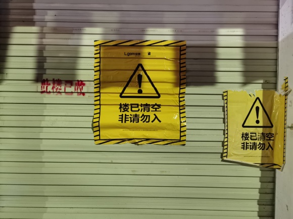 白石洲不再热闹,随处可见红色拆迁标语,拆了窗棂的楼房,路面禁止停车的黄色网格线,每栋楼前的清楼告示,院子里废弃的家具电器,商铺门前不再亮起的招牌灯箱,以及由各种围挡连接起来的“墙”。