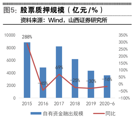 再来看股票质押业务,2019年,证券公司股票质押融出资金规模为4944.86亿元,比2019年下降24.61%,假设2020年融出资金规模以同样速度下滑,预计2020年年均股票质押规模下降至3956亿元,股质业务收入257.13亿元。随着股质风险的逐步化解,预计2021年券商股质规模下滑速度趋缓,在谨慎、中性、乐观三种假设前提下,融出资金规模分别为3500亿元、3800亿元、4000亿元,股票质押业务收入则分别为227.5亿元、247亿元、260亿元。