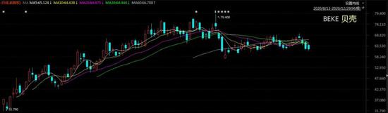 再来看看贝壳找房在资本市场上的表现。8月13日,上市首日开盘价为35.06美元,市值395亿美元。如今,其总市值已达734亿美元,股价一度达79.4美元。