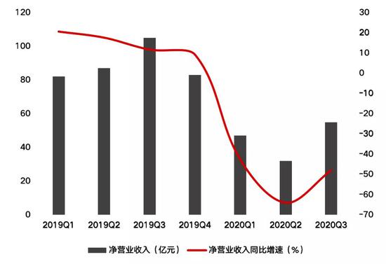 日前,该公司披露了2020年未经审计的第三季度财务业绩。数据显示,其第三季度净营业收入为55亿元,同比减少48%,环比增长73%;毛利润为44亿元,同比下滑47%,环比上涨94%。