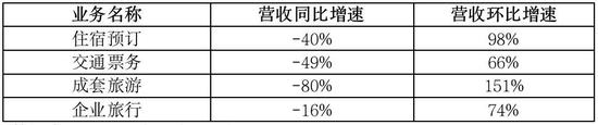 分业务条线来看,今年第三季度单季,该公司住宿预订收入为25亿元,同比减少40%,环比上涨98%;交通票务收入为19亿元,同比下降49%,环比增加66%;成套旅游收入为3.26亿元,同比下滑80%,环比上涨151%;企业旅行收入为2.82亿元,同比减少16%,环比增长74%。