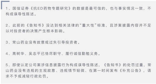 收到《告知书》后,常山药业开始了与河北证监局的“拉锯战”。常山药业董事长、总经理高树华,及常山药业副总经理、董事会秘书吴志平提出以下五点申辩意见: