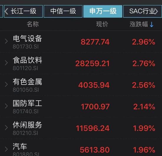 12月30日,昨日大幅调整的新能源、白酒等板块今日大幅反弹。申万一级行业中,电气设备、食品饮料、有色金属行业涨幅居前,分别上涨2.96%、2.76%、2.56%。