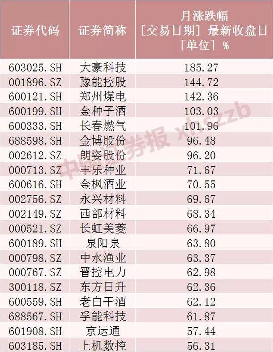 12月,大豪科技12月8日复牌后连续11个交易日涨停,豫能控股11个交易日10涨停,郑州煤电月内出现11次涨停,金种子酒月内出现7次涨停,长春燃气月内出现8次涨停,朗姿股份月内出现10次涨停。