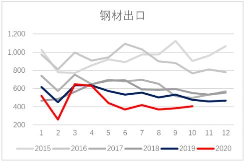 出口方面,1-10月份我国出口钢材4444万吨,累计同比去年同期低1066万吨。今年11、12月出口量预计仍会小幅回升。