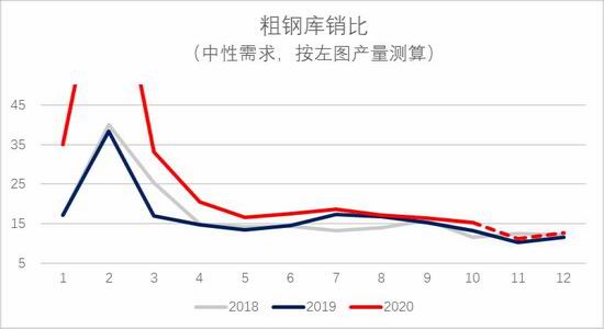 我们粗钢平衡表的粗钢产量口径使用Mysteel247家钢厂铁水产量样本以及富宝废钢日耗样本来作为基础数据测算。从产量、进出口和库存表观推算今年1-10月份国内粗钢需求累计同比增速为4.8%。但测算得结果后,11-12月的需求表现需要关注环比变化。由于11月截止目前需求月均水平仍比较高(预计环比10月高5%)。假设全年需求同比增幅在6%左右(中性测算),那么结合上面第一部分对应的产量的预估,到年底的粗钢库存绝对水平略高于去年同期,库销比也略高于去年同期。